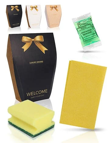 Inhalt: Jede Box besteht aus 3 wesentlichen Reinigungsutensilien in der Küche: 1 gelben Putzlappen, 1 gelben Putzschwamm & 1 Sachet Geschirrspülmittel.