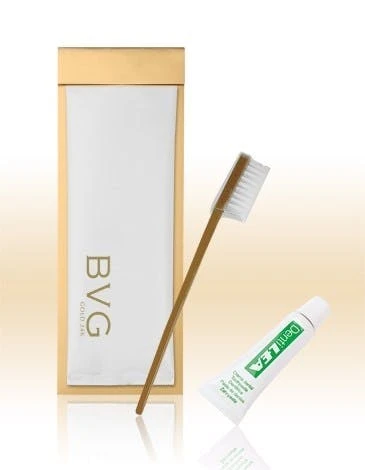 Zahnpflegeset im Etui, bestehend aus Zahnbürste und Zahnpasta im Sachet.